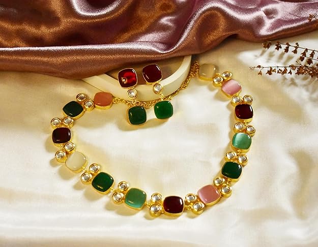 - Beautifully crafted natural stone neckpiece from Jiaara for a unique and stylish look. Made with pure brass and clear gold-tone finish, enhancing elegance and durability.