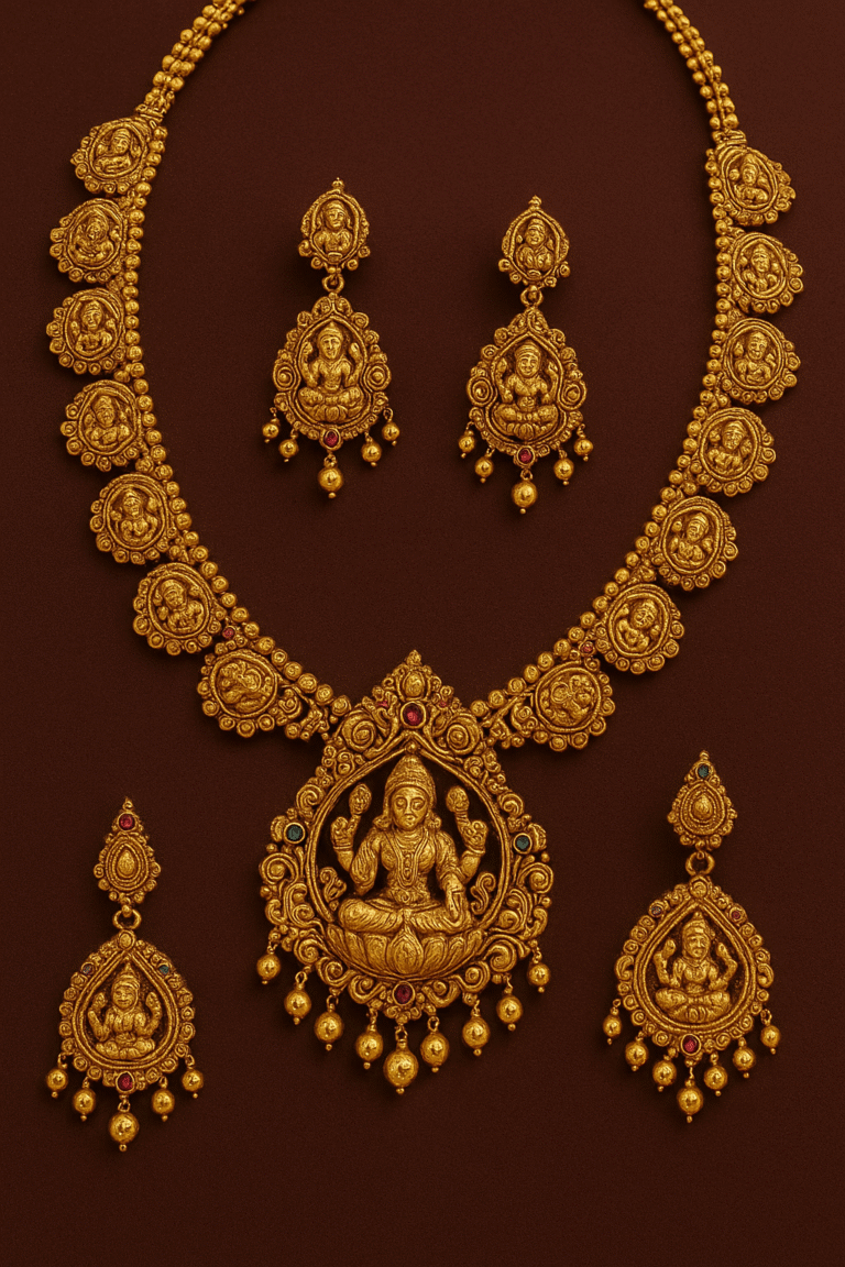Temple jewellery is crafted using pure gold, antique gold plating, or traditional handmade techniques. It features motifs of Goddess Lakshmi, Saraswati, Krishna, Ganesha and other divine figures.